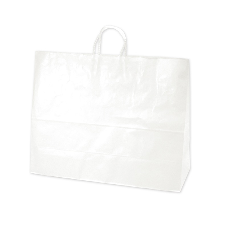 樹脂製の接着剤で手紐を取り付けた手提げ紙袋です。紐の結び目がなくすっきりし、物の出し入れがスムースで、ストックする際にかさばらないメリットがあります。大型サイズの中でも定番の縦型フォルム。汎用性の高い白無地。●手紐:PP紐白●入数:25枚