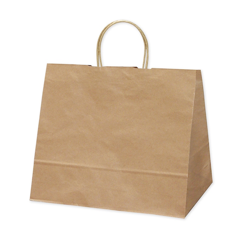 樹脂製の接着剤で手紐を取り付けた手提げ紙袋です。紐の結び目がなくすっきりし、物の出し入れがスムースで、ストックする際にかさばらないメリットがあります。マチが広く高さが低いタイプです。箱もののお持ち帰りに適しています。汎用性の高い未晒無地●手紐:紙紐3本撚り●入数:25枚