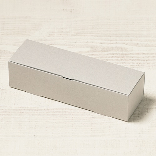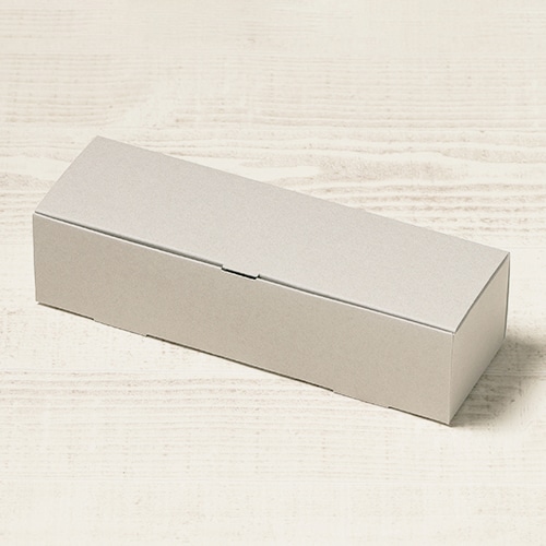 紙本来の肌触りとしっかりとした厚みがあり、控えめですが上品な印象の淡いグレーカラーが特徴でスリムタイプのパウンドケーキが1本収まります。高さ85mmですので、デコレーションにも対応できます。カットのパウンドケーキを詰めたり、焼き菓子を詰め合わせてギフトセットにもできます。