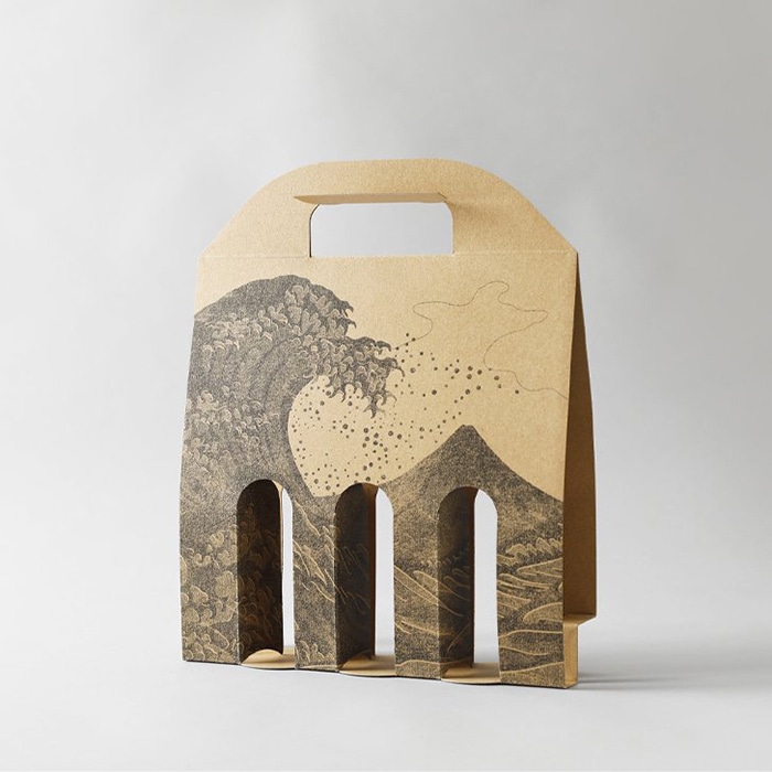 伝統的なデザインで日本の良さを表現した「波」。ビール小瓶(330ml程度)・日本酒小瓶(300~330ml程度)等の小瓶サイズが3本入る取っ手付きのギフトパッケージです。※瓶の形状次第では対応できない物もございます。例:ワインのハーフボトル(375ml程度)は対応出来ないものもございます。瓶のラベルが見えるように窓を開けた構造となってますのでパッケージに入れた状態で陳列するとより商品の見栄えを演出する事が出来ます。段ボール素材を直接印刷した仕様になっており風合いのある質感となっております。お勧めのお酒をアソートして販売するのに最適な商品です。●1箱あたりの重量:86g