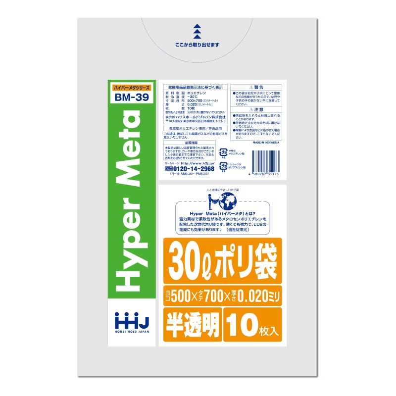 ハウスホールドジャパン ポリ袋 30L BM34 半透明 10枚入 1冊(ご注文単位100冊)【直送品】