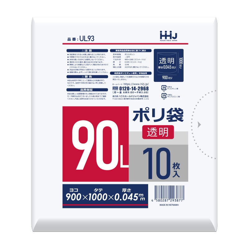 ハウスホールドジャパン ポリ袋 90L UL93 透明 10枚入 1冊(ご注文単位25冊)【直送品】