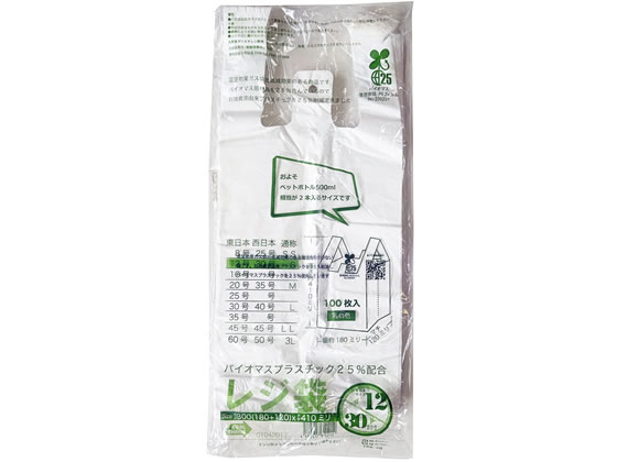 【レジ袋有料化対象外】生物由来の有機資源を原料としたバイオマス成分を25%含んだレジ袋です。バイオマスマーク取得済みで、「プラスチック製買物袋有料化制度」の対象外とすることが可能です。主原料のサトウキビは、育成時に光合成をして大気中のCO2を吸収するため、石油化学由来の原料と比較すると大幅なCO2の削減に貢献します。買い物客に有償でお渡しすることも考慮し、本体1枚1枚にパッケージとは異なるJANコードを印字してあります。乳白色。食品衛生法規格基準適合商品です。東日本12号/西日本30号に準じた規格となりますが、サイズは若干異なりますのでご注意ください。●入数:100枚●ハンガータイプ●表面エンボス加工あり●容量の目安:缶コーヒー190ml×6本【印字内容】この袋はサトウキビ由来のバイオマス成分を25%含んだレジ袋です。「CO2排出量削減」や「石油資源の節約」に貢献しています。