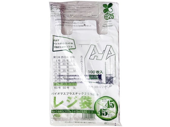 【レジ袋有料化対象外】生物由来の有機資源を原料としたバイオマス成分を25%含んだレジ袋です。バイオマスマーク取得済みで、「プラスチック製買物袋有料化制度」の対象外とすることが可能です。主原料のサトウキビは、育成時に光合成をして大気中のCO2を吸収するため、石油化学由来の原料と比較すると大幅なCO2の削減に貢献します。買い物客に有償でお渡しすることも考慮し、本体1枚1枚にパッケージとは異なるJANコードを印字してあります。乳白色。食品衛生法規格基準適合商品です。東日本45号/西日本45号に準じた規格となりますが、サイズは若干異なりますのでご注意ください。●入数:100枚●ハンガータイプ●表面エンボス加工あり●容量の目安:ペットボトル飲料2L×3本【印字内容】この袋はサトウキビ由来のバイオマス成分を25%含んだレジ袋です。「CO2排出量削減」や「石油資源の節約」に貢献しています。