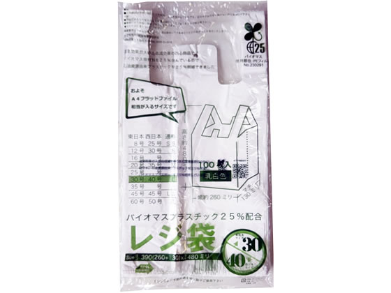 紺屋商事 バイオマスレジ袋乳白 E30W40 (100枚/冊) 0.015×260(390)×480 01042030 1パック(ご注文単位1パック)【直送品】