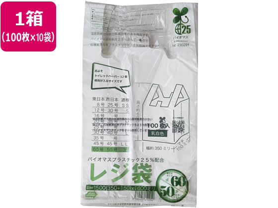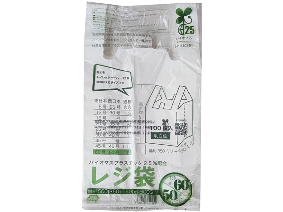 紺屋商事 バイオマス25%配合レジ袋(乳白) 60号 100枚 1袋(ご注文単位1袋)【直送品】