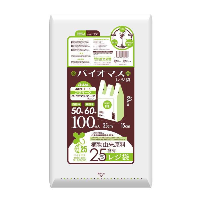 ハウスホールドジャパン レジ袋 バイオマス25% 25号 TX25 乳白 100枚入 1冊(ご注文単位60冊)【直送品】