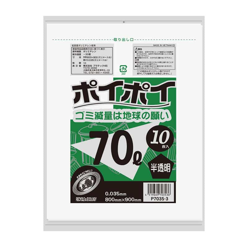 プラテック45 ゴミ袋 ポイポイ 半透明 0.035mm 70L 10枚入 P7035-3 1束(ご注文単位40束)【直送品】
