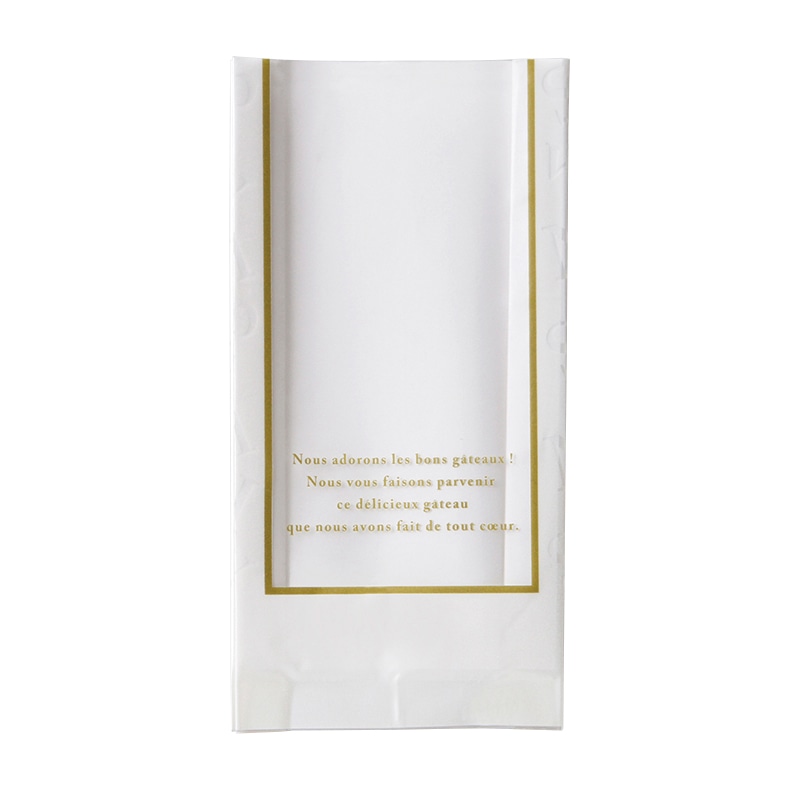 フランス語デザインがオシャレなGSパック。開けやすいVカット入りで、焼き菓子にぴったりです。●乾燥剤使用可●入数:1000枚