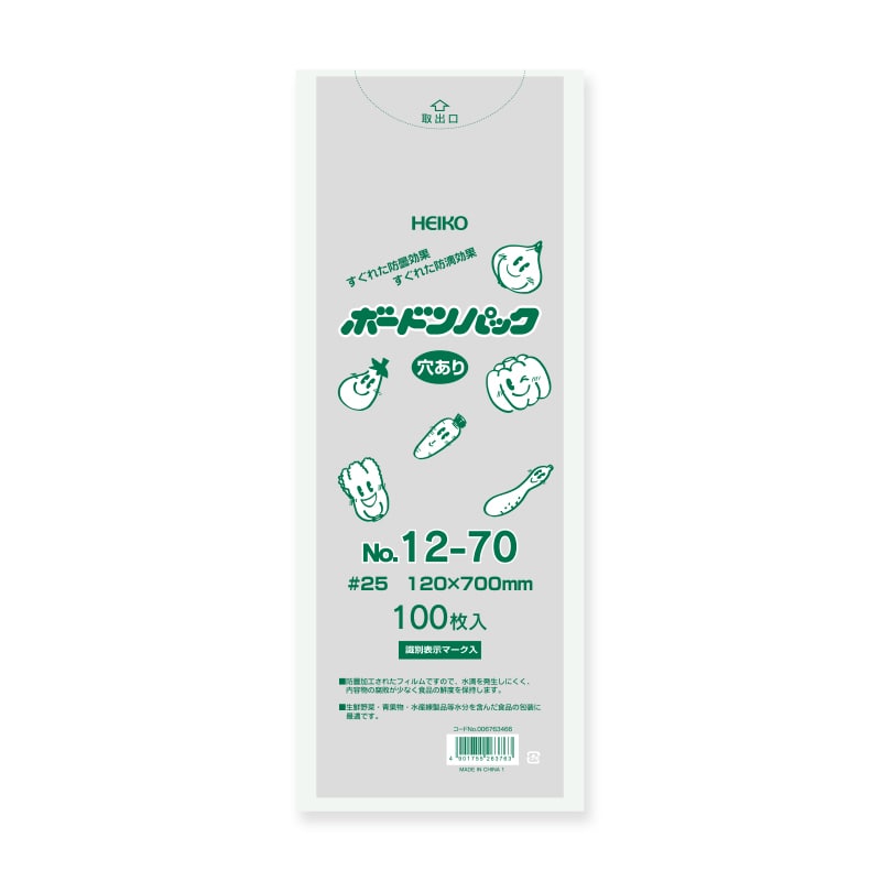 曇りにくく、水滴がつきにくいので、農産物・青果物の包装に適しています。生鮮野菜、果物を扱う青果店やスーパーなどの販売店、農家、市場におすすめ。通気性を良くするため、空気穴があります。※商品は縦に2つ折で包装されております。食品衛生法規格基準適合商品です。●おすすめ農産物:ネギ/ごぼう●入数:100枚