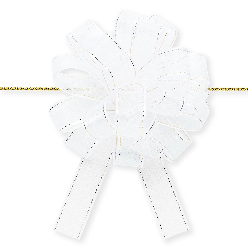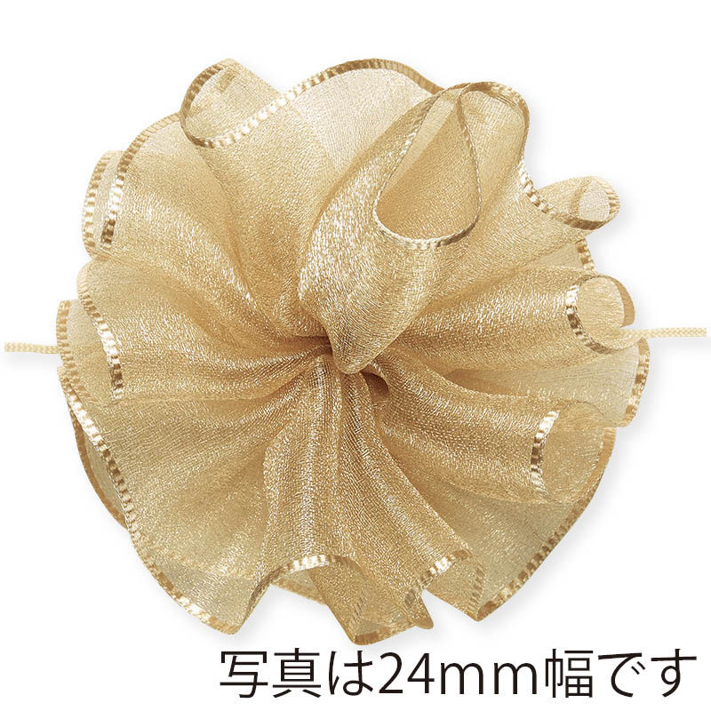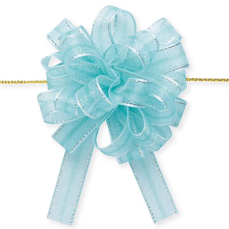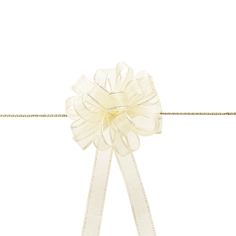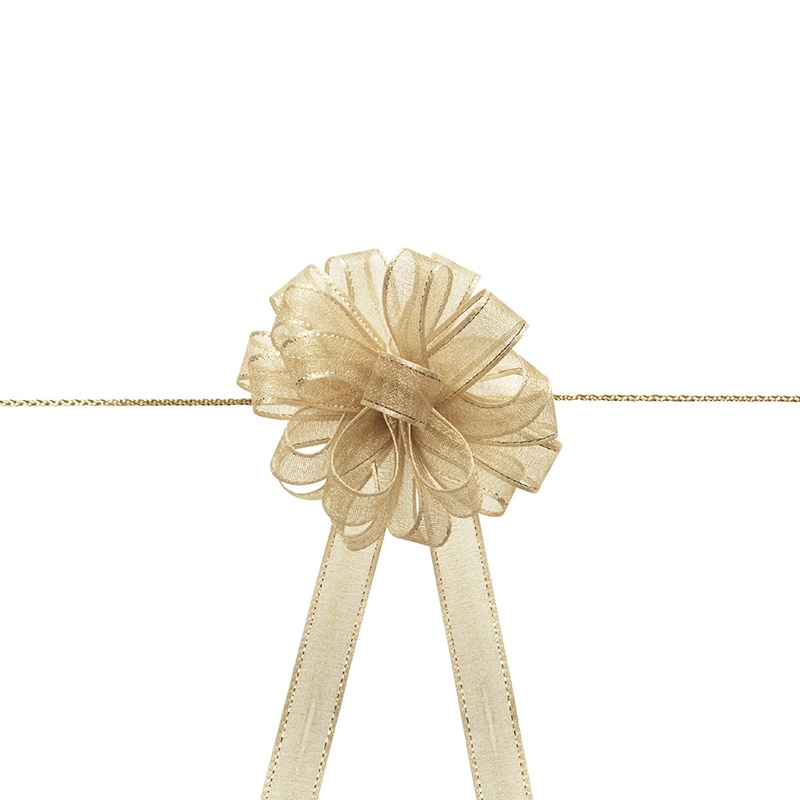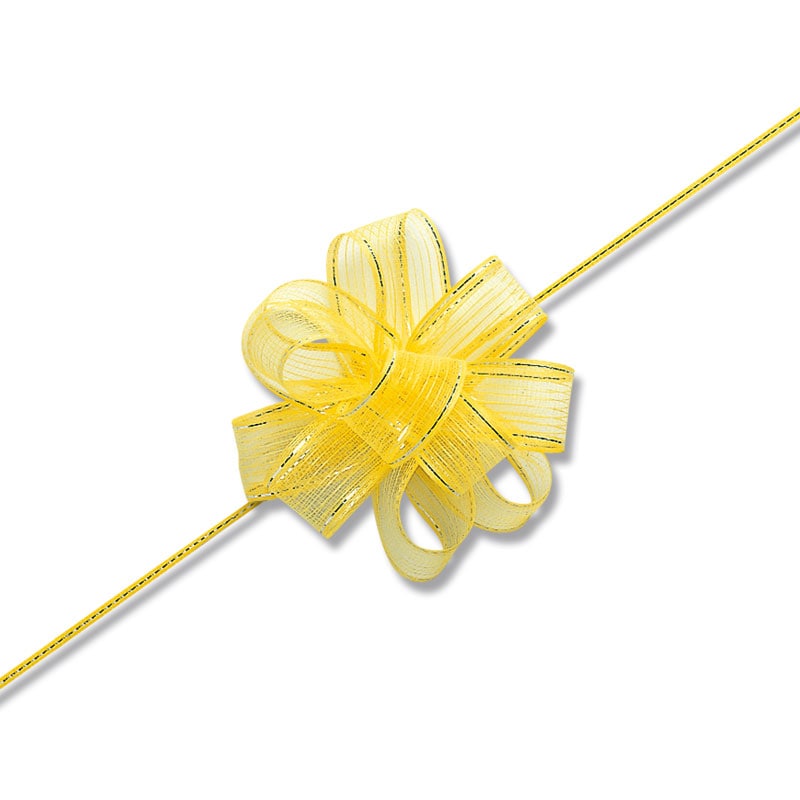 光沢のあるオーガンジーとサイドの金線が可愛いワンタッチリボンです。中心のヒモを引くと、ワンタッチでボウができあがります。※製造の都合上、リボン中央にラインが入る場合がございますので、ご了承下さい。