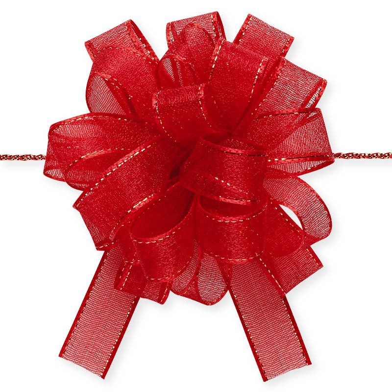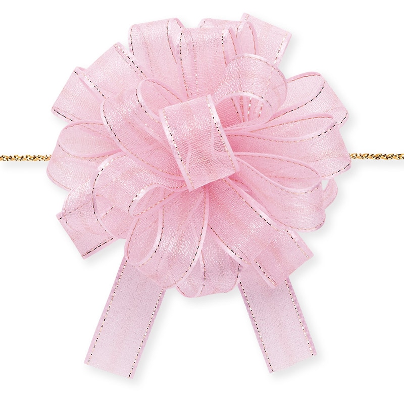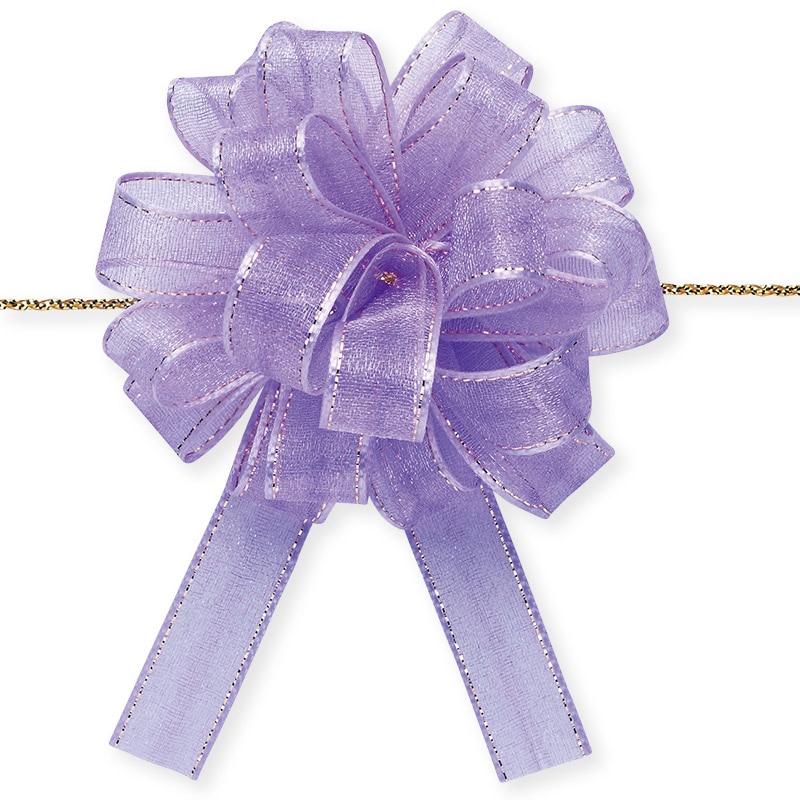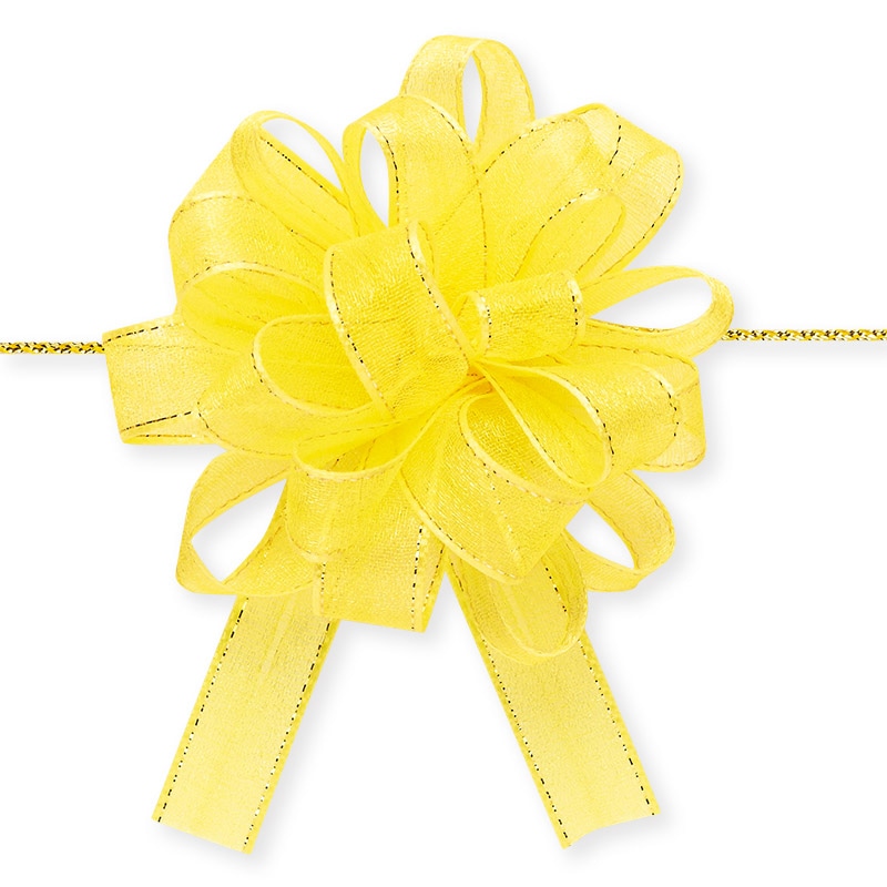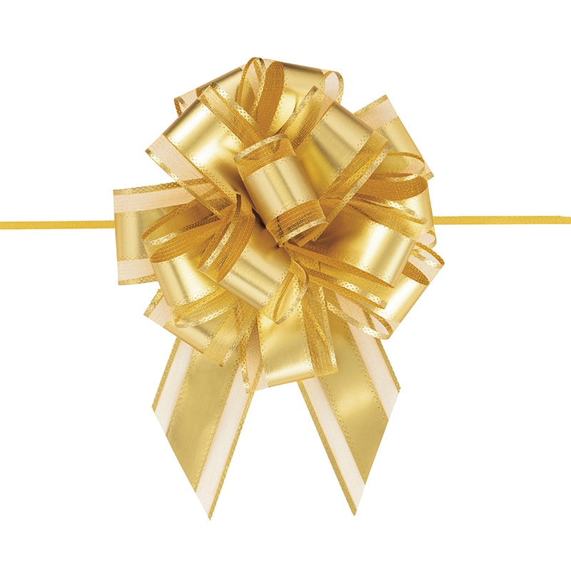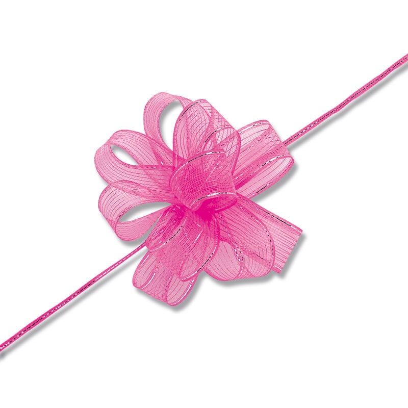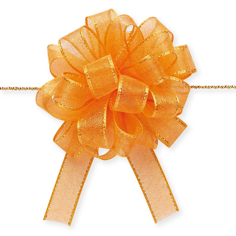 光沢のあるオーガンジーとサイドの金線が可愛いワンタッチリボンです。中心のヒモを引くと、ワンタッチでボウができあがります。※製造の都合上、リボン中央にラインが入る場合がございますので、ご了承下さい。