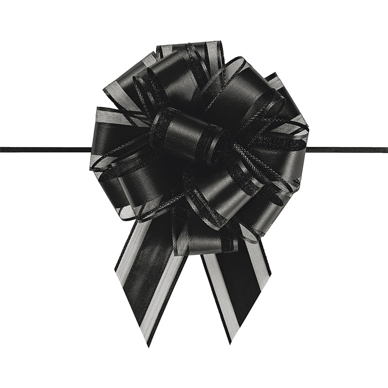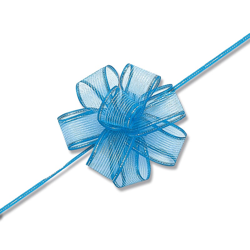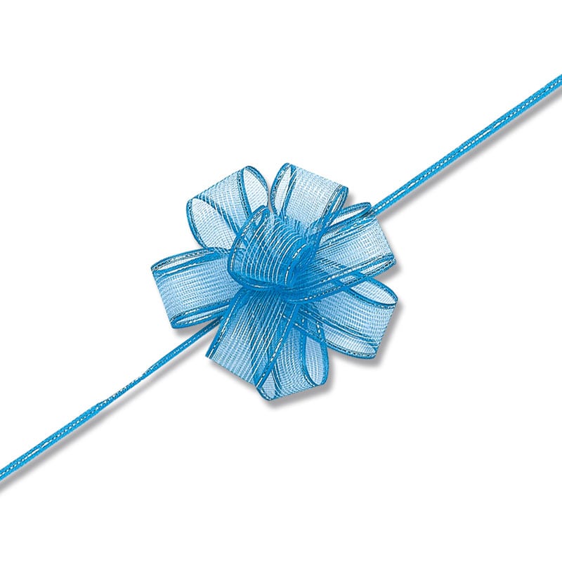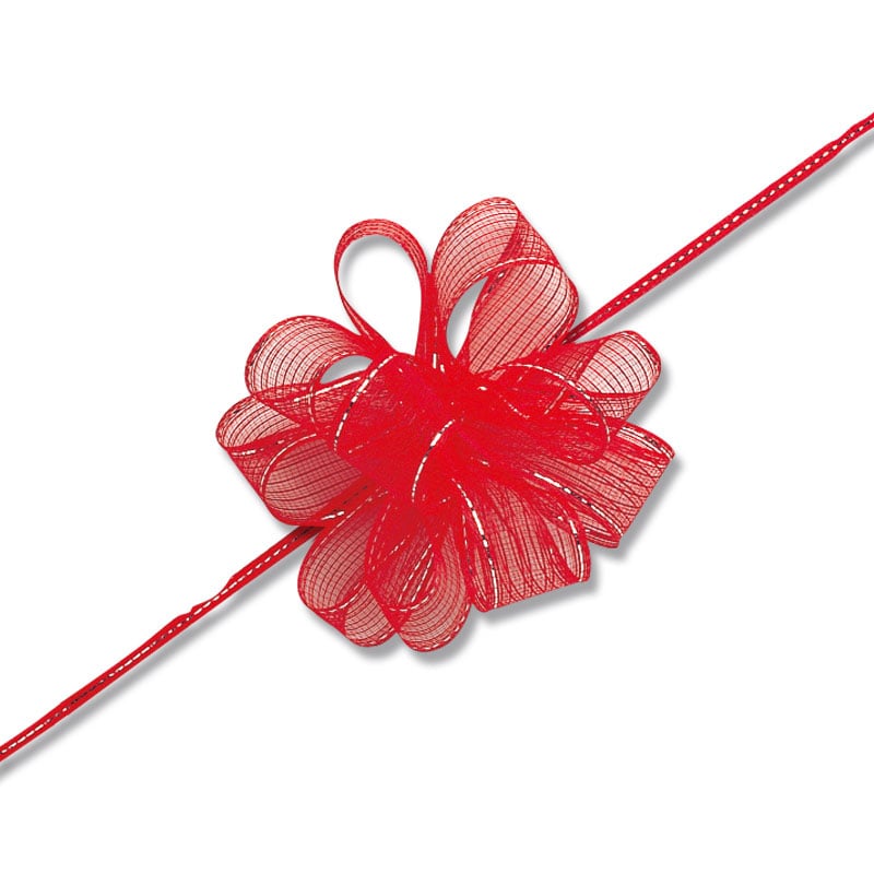 1~1.5mにカットし中心の紐を引くとワンタッチでリボンボウになります。つぶれる心配もなくコンパクトに収納でき、華やかなラッピングに仕上がります。完成サイズ:約70mmφ