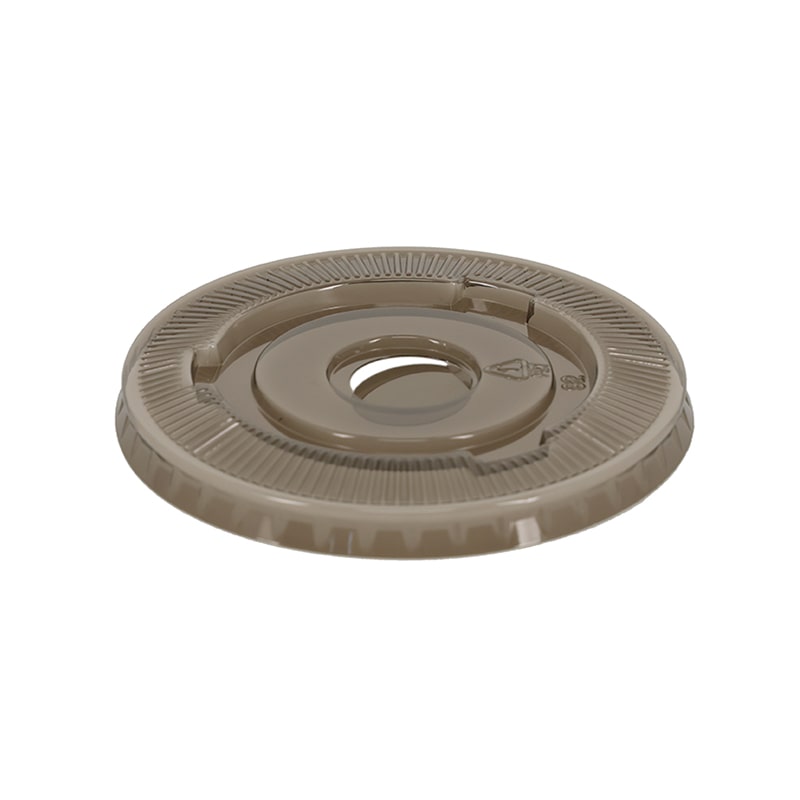 「HEIKO透明カップA-PET14オンス・16オンス・20オンス・23オンス」用の透明平フタです。半透明のブラックカラー。天面に丸型のストロー穴付き。食品衛生法規格基準適合商品です。※穴はアルファベットの「C」の文字のように、完全にくりぬかれた状態ではありません。●入数:50個