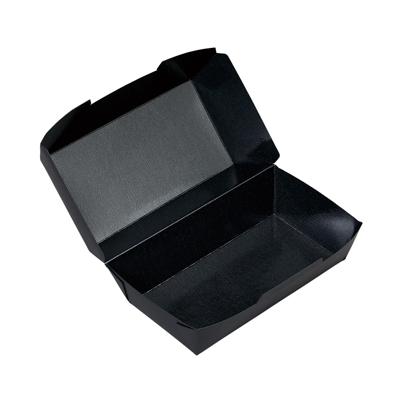 折蓋式の紙製容器です。高蓋タイプでハンバーガー2個向け。ブラック色。●入数:25個