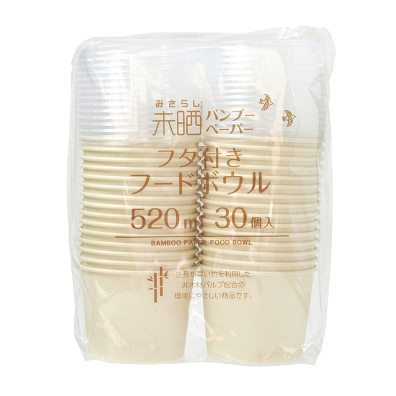 生長が早いとされる竹製パルプを使用した、環境にやさしいボウルです。無漂白でナチュラルな風合いです。PP製のフタ付き。フタをした状態でスタッキングできます。お弁当や行楽におすすめです。●耐熱温度:80℃●容量:約520ml●入数:30個