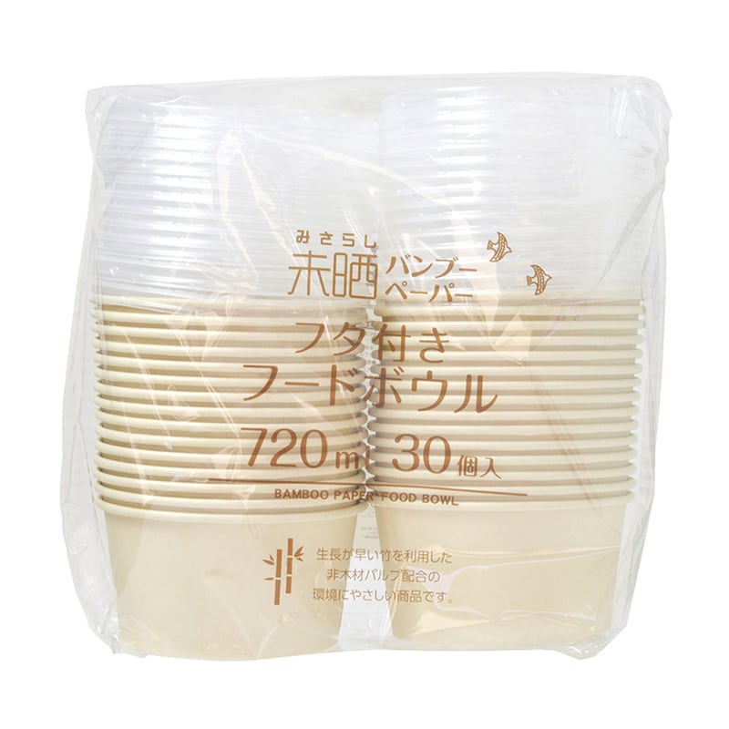 生長が早いとされる竹製パルプを使用した、環境にやさしいボウルです。無漂白でナチュラルな風合いです。PP製のフタ付き。フタをした状態でスタッキングできます。お弁当や行楽におすすめです。●耐熱温度:80℃●容量:約720ml●入数:30個