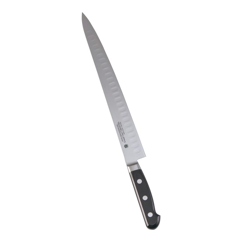 ●刀身:モリブデンバナジウム鋼/ハンドル:18-8ステンレス鋼●■一体構造刀身とハンドルはすき間のない一体構造で非常に衛生的です。 ■本研刃造りプロの技術者により、本刃付けする前に研ぎ直しを容易にするため、水研の荒砥・中砥を使用し、刃基を研ぎだしてあります。 ■本刃付け砥石による本格的な刃付けを施し、鋭い切れ味を長く持続させます。 ■モナカハンドル ハンドル部を空洞にし、軽くていつまでも美観を保つ「ステンレスモナカ構造」を採用。また、18-8抗菌性ステンレス鋼を使用し、水・薬品等の高圧・高温殺菌洗浄を可能にした衛生的なハンドルです。※塩素などでの殺菌はご遠慮ください。 ●刃渡×全長mm:300×433