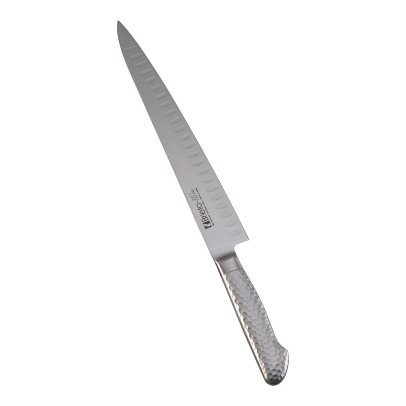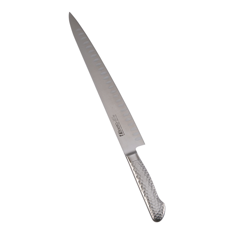 ●へこみの部分に空気が入ることにより、刃離れの良さと、軽い切れ味を実現しました。切断時に側面にかかる密着抵抗を最小にしてあります。庖丁側面に密着しにくいので作業性が良く、切れ味が良く、しかも刃研ぎの面積がせまいため、非常に研ぎ易い設計です。●刃渡310mm