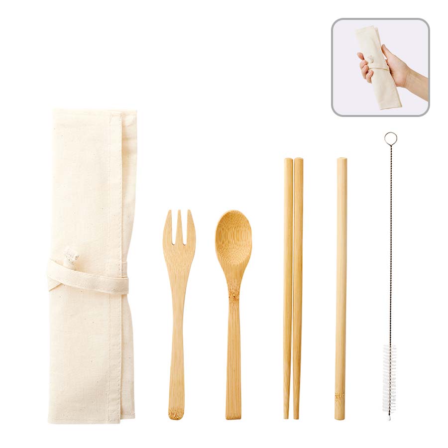 ●サイズ:袋:展開時/約255×135mm、ひも/約260mm スプーン:約30×160×7mm 箸:約200mm フォーク:約25×160×7mm ストロー:約φ8×200mm ストローブラシ:約220mm ●材質:袋:コットン スプーン・箸・フォーク・ストロー:天然竹 ストローブラシ:ステンレス 他●地球に優しい竹繊維お使用したバンブータイプのカトラリーセットです。●普段よく使うスプーン、お箸、フォーク以外にストローとブラシのセットとなっており、繰り返し使用できるのでプラ削減ができるエコ商品です。●紐付きのカトラリー袋を付属しており、持ち運びの際はカトラリーを袋に入れて紐を括るだけで簡単に持ち運びができます。