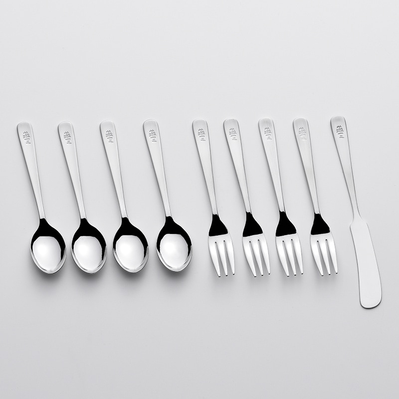 金属加工の街として有名な新潟県燕三条地区で製造された長く使えるシンプルなカトラリーです。コーヒースプーン×4、ヒメフォーク×4、バターナイフ×1の9点セット。持ち手は上質なサテン仕上げ。すくう部分は口当たり滑らかなミラー仕上げ。普段使いから来客向けに揃えておきたいセットです。●バターナイフ:全長140×幅17mm●重量:コーヒースプーン14g/ヒメフォーク12g/バターナイフ14g