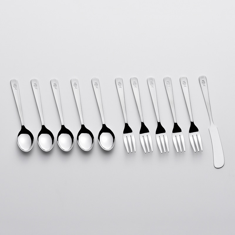金属加工の街として有名な新潟県燕三条地区で製造された長く使えるシンプルなカトラリーです。コーヒースプーン×5、ヒメフォーク×5、バターナイフ×1の11点セット。持ち手は上質なサテン仕上げ。すくう部分は口当たり滑らかなミラー仕上げ。普段使いから来客向けに揃えておきたいセットです。●バターナイフ:全長140×幅17mm●重量:コーヒースプーン14g/ヒメフォーク12g/バターナイフ14g