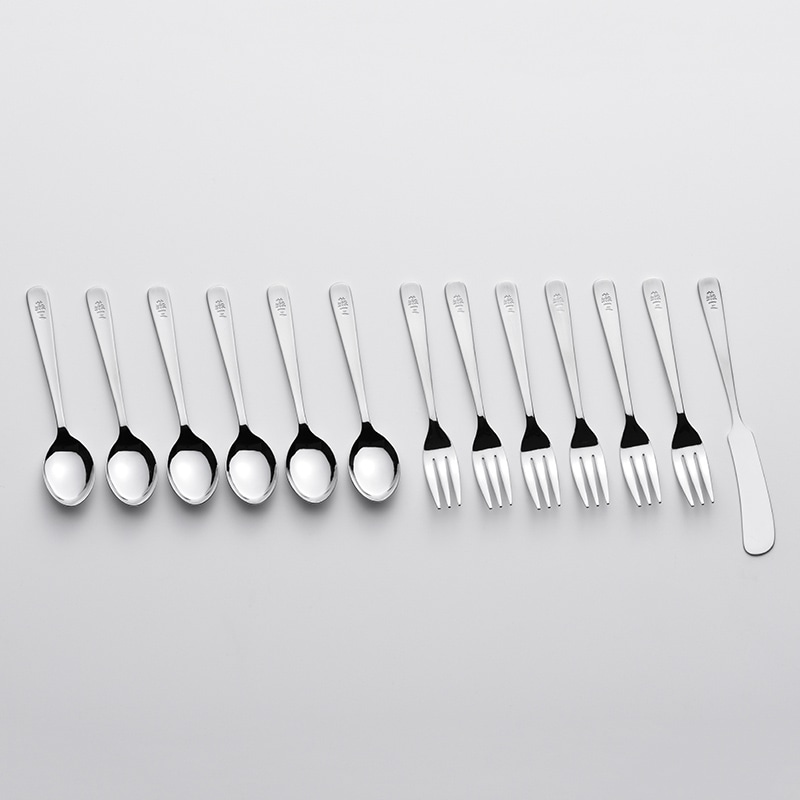 金属加工の街として有名な新潟県燕三条地区で製造された長く使えるシンプルなカトラリーです。コーヒースプーン×6、ヒメフォーク×6、バターナイフ×1の13点セット。持ち手は上質なサテン仕上げ。すくう部分は口当たり滑らかなミラー仕上げ。普段使いから来客向けに揃えておきたいセットです。●バターナイフ:全長140×幅17mm●重量:コーヒースプーン14g/ヒメフォーク12g/バターナイフ14g
