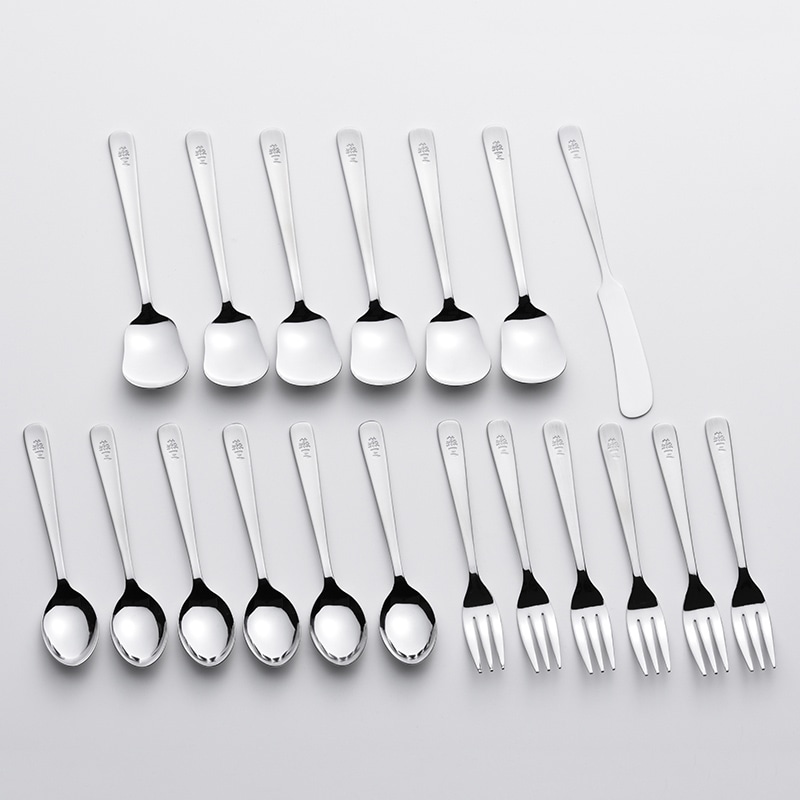 金属加工の街として有名な新潟県燕三条地区で製造された長く使えるシンプルなカトラリーです。コーヒースプーン×6、ヒメフォーク×6、角アイススプーン×6、バターナイフ×1の19点セット。持ち手は上質なサテン仕上げ。すくう部分は口当たり滑らかなミラー仕上げ。普段使いから来客向けに揃えておきたいセットです。●角アイススプーン:全長125×幅29mm●バターナイフ:全長140×幅17mm●重量:コーヒースプーン14g/ヒメフォーク12g/角アイススプーン16g/バターナイフ14g
