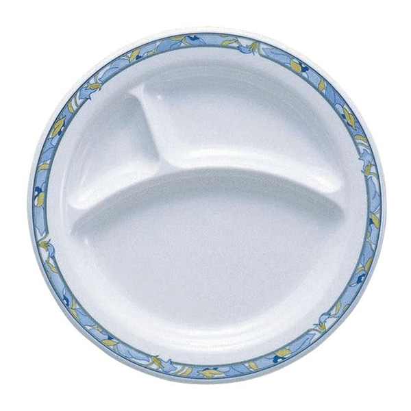 使い勝手抜群の三ツ切皿。帯状にアレンジされたブルーの花が小粋な印象です。リムがあって持ちやすく、スタッキング性抜群です。別売の皿枠丸型中「DP-26」、皿枠丸型大「DP-40」、フードカバー「F-30」がご利用いただけます。