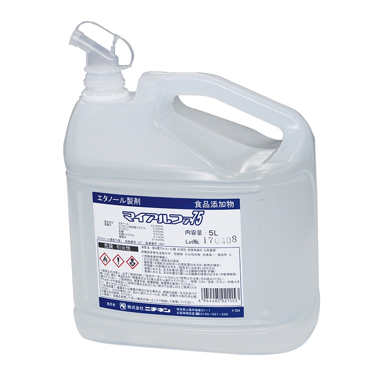 ●食品の品質保持・衛生管理、調理機器・食品容器などの除菌にお使い下さい。●エタノールとグリセリン脂肪酸エステルの相乗効果により、優れた除菌力を発揮します。●非危険物。●食品添加物なので安心・安全。中性なので食品の風味を損なわず、調理機器等のサビの心配もありません。●使用量に合わせて選べる3サイズ。【食品添加物】●〔保管及び取り扱い上の注意〕:火気に近づけない。●取り扱う場合、漏れ、あふれ、または飛散しないように注意し、換気を充分行う。●みだりに加熱、加減圧したり噴霧、蒸散させない。●直射日光の当たらない温度の低い場所に密栓して保管し、転倒、落下、破損、漏洩のないよう注意する。●子供の手の届くところに置かない。●認知症の方などの誤飲や他の事故を防ぐため、置き場所に注意する。●移し替える場合、専用の容器にその品名と、注意事項などを明記する。●目、その他粘膜などに触れさせない。●飲んではいけない。●ワックス、ペンキ、ニスなどの塗装面、木製品や紙製品、家具、床、衣類、メガネ、時計、皮革、樹脂材料(アクリルやスチロールなど)、ゴムは変色や膨潤、破損することがあるため、付着しないように注意する。また、液が付着したら、すぐに拭き取る。●〔応急処置〕:初期火災の場合は、大量の水、またはアルコール用消火器で消火する。●目、その他粘膜などに触れた場合は、大量の水で洗い流す。飲み込んだ場合は、吐かずに口をすすぎ、水を飲むなどの処置をする。気分が悪くなった時は、使用を中止する。いずれの場合も異常が残る場合は医師の診断を受ける。●成分(W/W%):エタノール : 57.2%、グリセリン脂肪酸エステル : 0.1%、乳酸ナトリウム : 0.05%、水 : 42.65%●入数:1ケース(4.5L/本×3本入り)●13.1kg●こちらの商品は事業者様向け商品です。●こちらの商品は取寄せ商品となり納期が