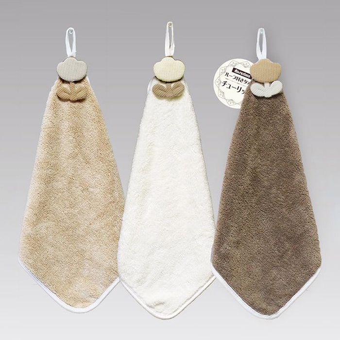 ふわふわマイクロファイバーのループ付きハンドタオルです。可愛いチューリップのモチーフ付き。