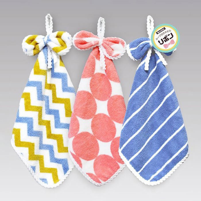ふわふわマイクロファイバーのループ付きハンドタオルです。カラフルな色柄リボンがポイント。
