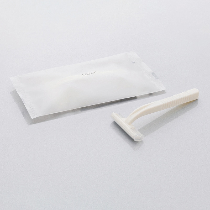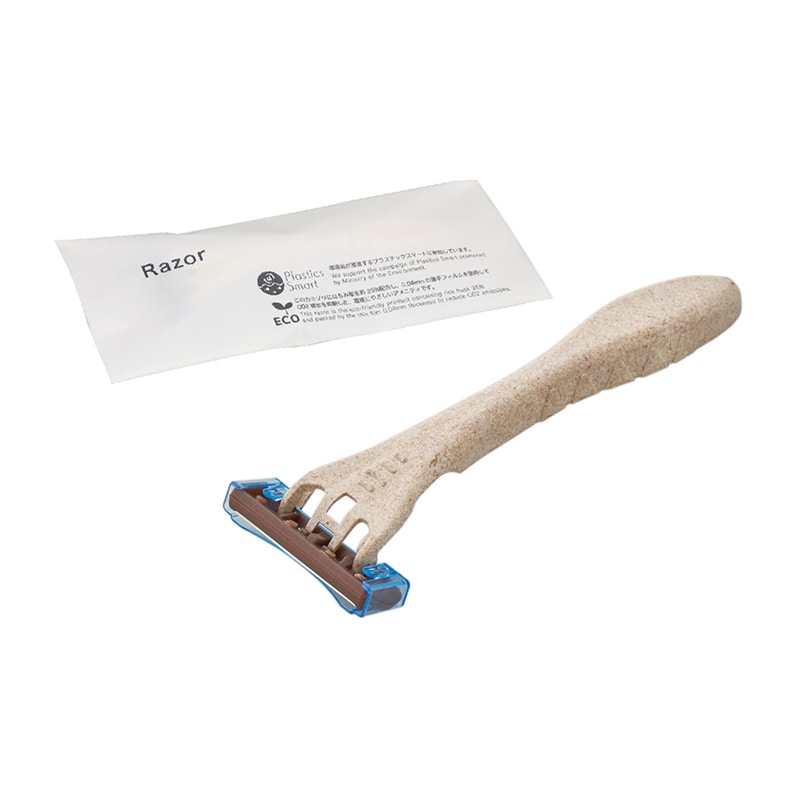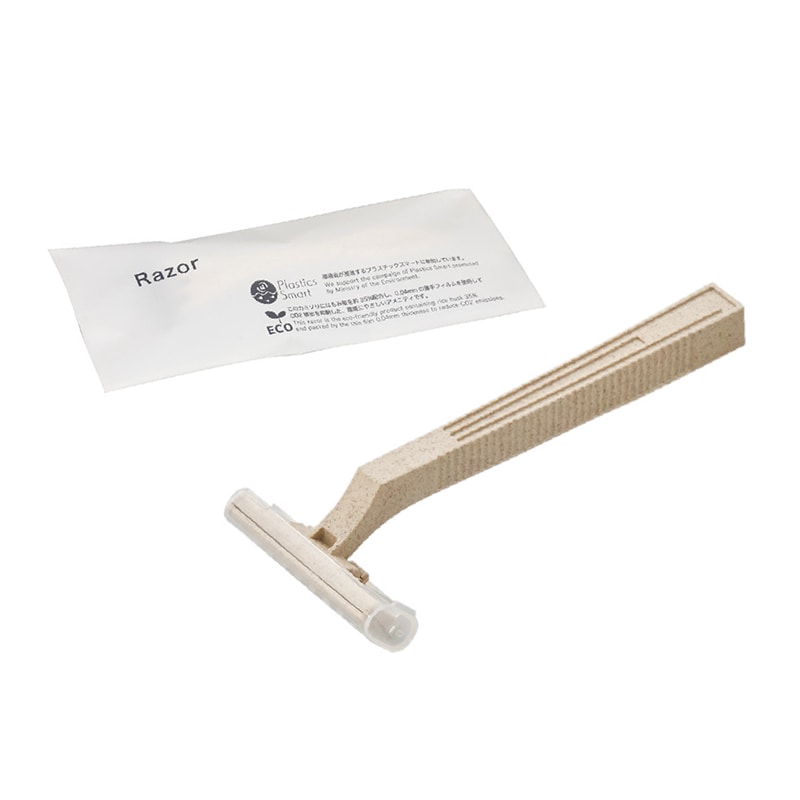 石油由来の樹脂削減のため、ハンドルにはバイオマス由来のもみ殻を12.5%配合。また包装材フィルムにはコーンスターチを25%配合した環境に優しいアメニティです。●入数:100個