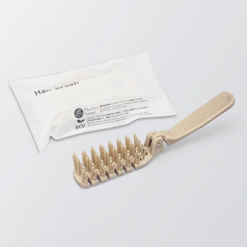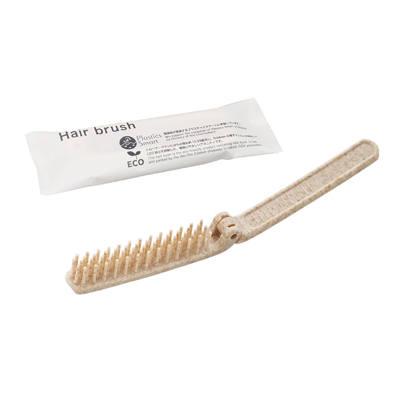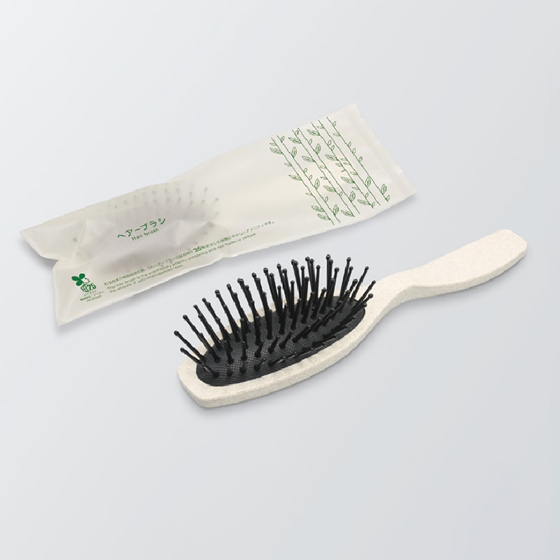 もみ殻を約40%配合し、プラスチック使用量を抑えた環境にやさしいヘアーブラシです。包材フィルムにはコーンスターチを25%配合。●入数:300個