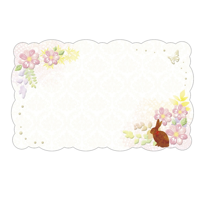 抜き型で、デザインに合わせた浮き出し加工を施した、優しいタッチのデザインが特徴のカードです。プレゼントやラッピング用品に最適です。手書きメッセージを書いて商品説明カードとしてもお使いいただけます。もちろんプライスカードとしてもご利用可能。華やかなレースと目を引くお花にウサギのシルエットを合わせ、甘すぎない雰囲気にまとめたデザイン。●入数:100枚