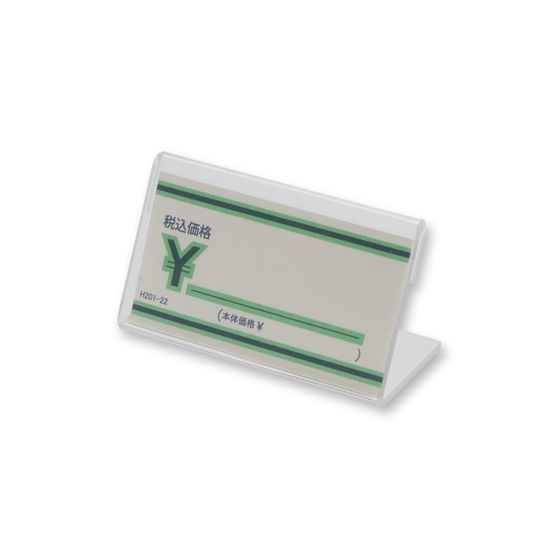 透明L型カード立て商品です。サイズはH45mm×W66mm×D27mm、カード-H40mm×W65mmです。傾斜がついて見やすいL型です。1袋10個入りです。アクリル樹脂素材(2mm厚)で透明感がありますショーカード入りとなっており、ご購入後すぐご使用頂けます。またショーカードは単品でも販売しています。小売店・販売会・フリーマーケットで案内版・プライスカード・メニューなどアピールしたい印刷物を差し込んでカードスタンドとして使用して頂くのに最適です。またサイズ違いの商品も取り扱いしています。●ショーカード入