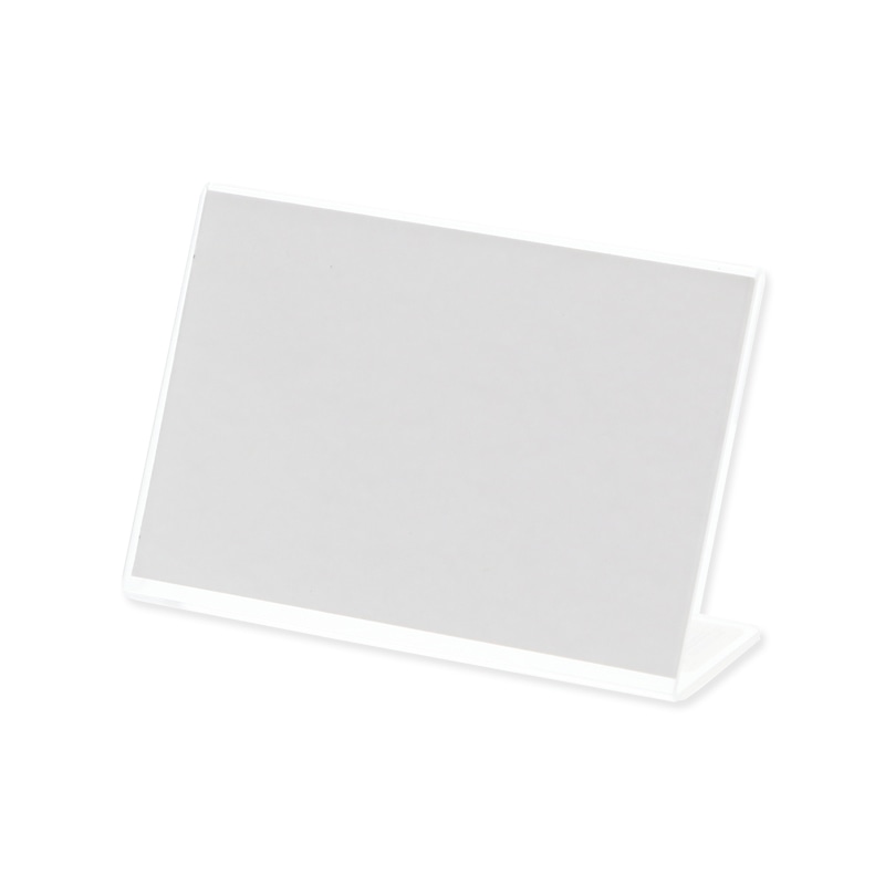 透明L型カード立て商品です。サイズはH60mm×W86mm×D31mm、カード-H55mm×W85mmです。傾斜がついて見やすいL型です。1袋10個入りです。アクリル樹脂素材(2mm厚)で透明感がありますショーカード入りとなっており、ご購入後すぐご使用頂けます。またショーカードは単品でも販売しています。小売店・販売会・フリーマーケットで案内版・プライスカード・メニューなどアピールしたい印刷物を差し込んでカードスタンドとして使用して頂くのに最適です。またサイズ違いの商品も取り扱いしています。●ショーカード入
