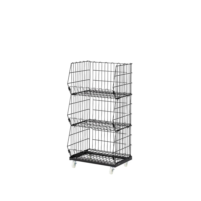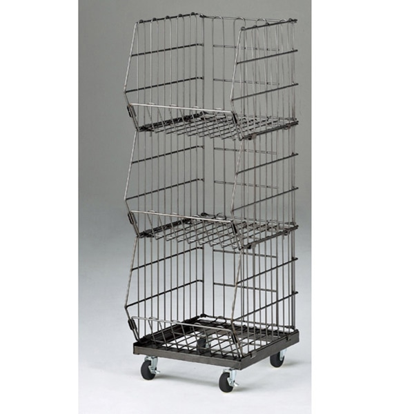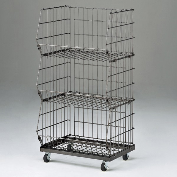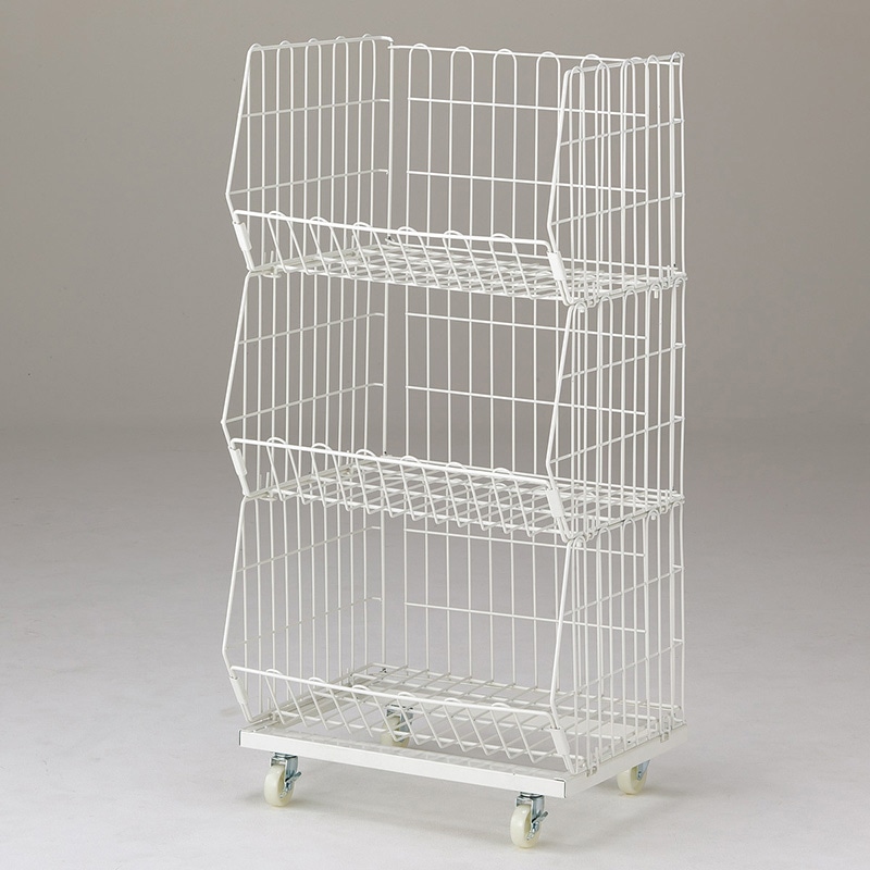 ヒナ段タイプなので、下の段の商品も陳列できます。●線材/カゴ:φ3mm 脚部・枠部分:φ5mm ●重量:11kg ●樹脂製双輪キャスター:直径4cm(ストッパー付き・無し×各2個)ボルト径:3/8w ●耐荷重:10kg/段 ●お客様組立