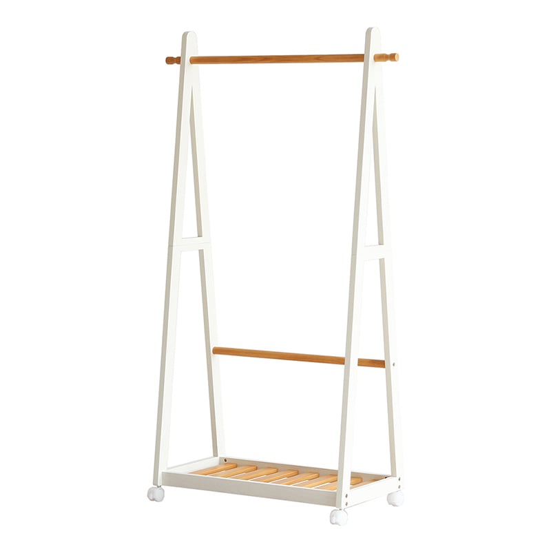 木の質感を活かしたツートン仕様のハンガー。デザイン性・ファッション性を追求し、カラーや質感にこだわりました。キャスター付きでお掃除の時も楽に移動ができます。清潔感のあるホワイトベース。●耐荷重:ハンガー約2kg/スノコ約10kg●重量:約4.4kg●組立品●組立時間:約40分●工具同梱