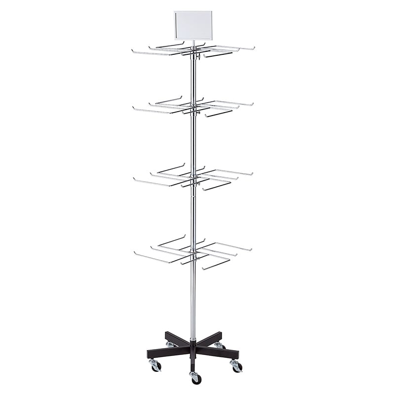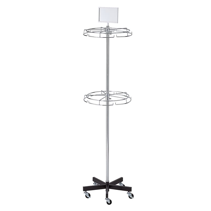 リングを自由に高さ調節できます。靴下・手袋などの陳列に最適です。●寸法 線材:直径6mm 重量:7.3kg 耐荷重:5kg/段 樹脂製単輪キャスター:直径5cm (ストッパー付き×2個・無し×3個) ボルト径:3/8w 受け金具付き ※お客様組立て ●ポップ立て別売(61-102-3-1)