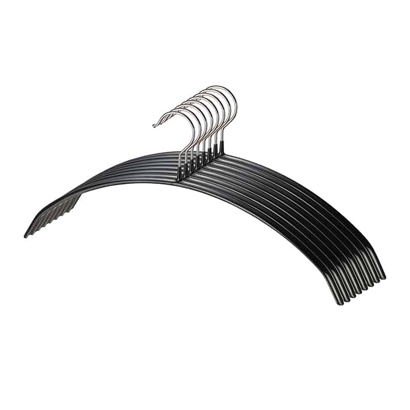 ビニールコーティングが施された滑り落ちにくいハンガー。するすると滑るブラウスや、華奢な作りのキャミソールも、衣類がハンガーから落ちにくくなっています。丸みを帯びた形状で、セーターなど柔らかな素材も肩が出にくい。シンプルな形状なのでクローゼットの中がかさばらず、すっきりと収納できます。●8本組