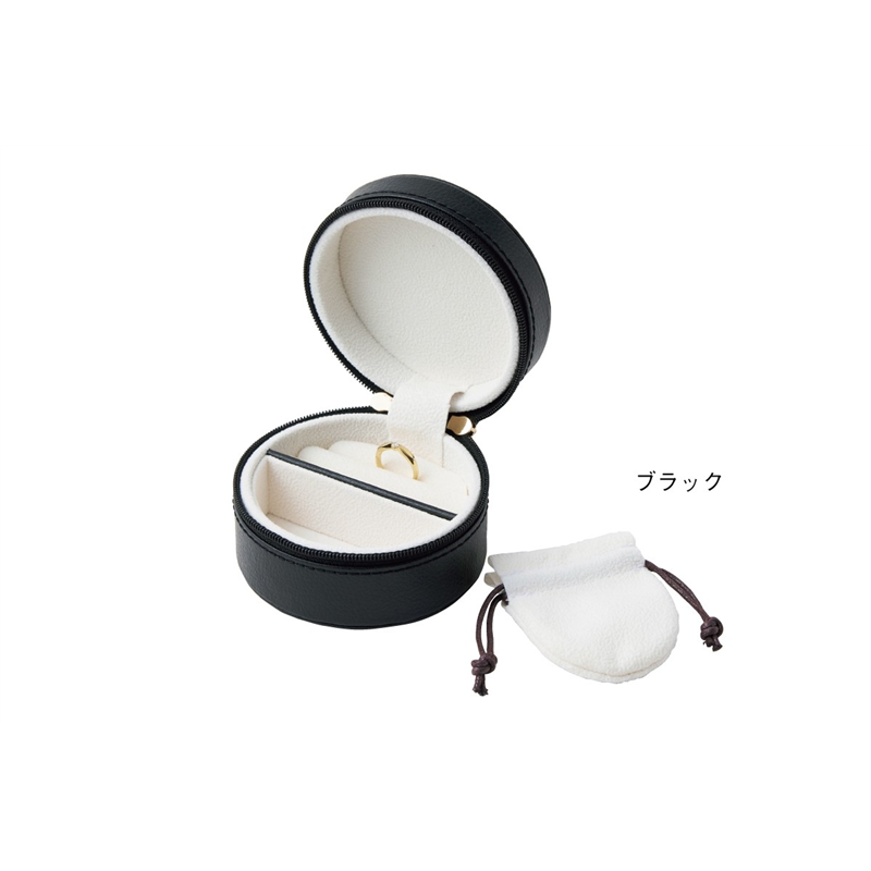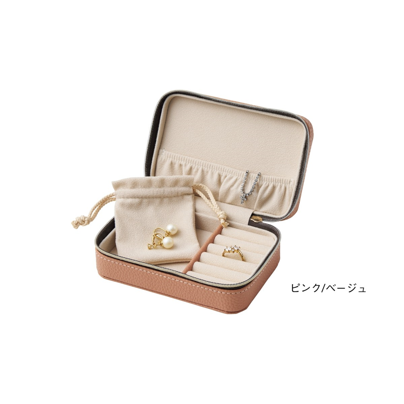 外箱:キャラメル箱。こちらのジュエリーポーチは、リング・ピアス・イヤリング・ネックレスなどの収納が可能となっております。特徴としては合皮レザーで出来ており、付属の巾着袋もポイントです。