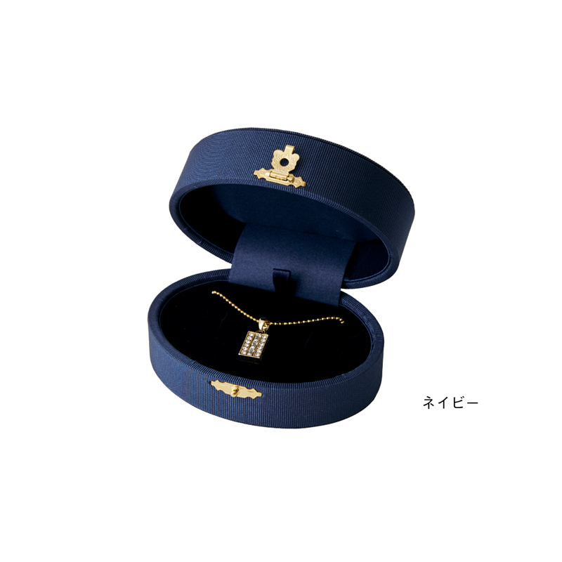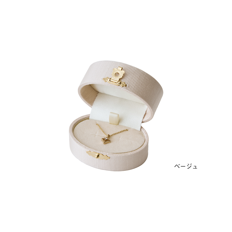 外箱:かぶせ式。こちらのジュエリーケースは、シャンタン調とスエード調で出来ています。正面のゴールドの留め具もポイント。優しいスエード調により、ジュエリーを保護し、安心して収納することができます。