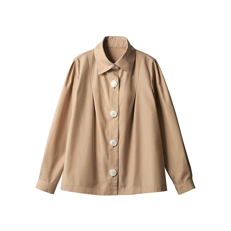 ウイングカラーが特徴的なブラウスは、前にも後ろにもタックを入れて、ふんわりしたシルエットになります。エプロンを着けた時、かわいらしく見えるデザイン。袖山のタックが、シンプルなフォルムのアクセントになります。11号(着丈:65 バスト:121 肩巾:39 袖丈:60)