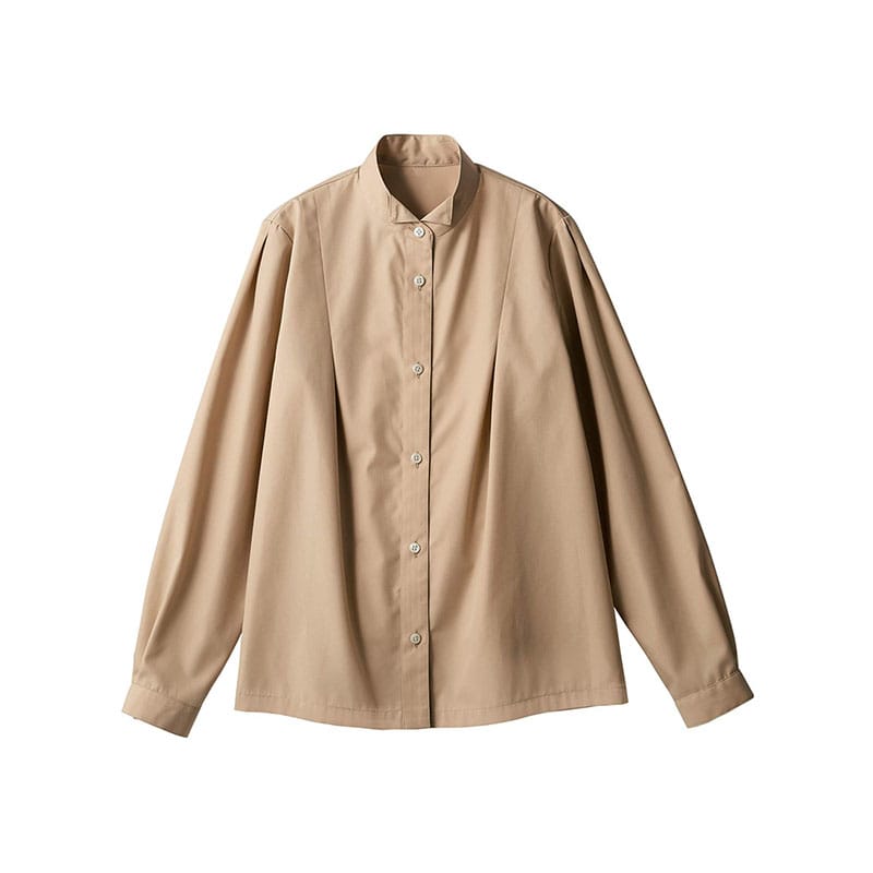 ウイングカラーが特徴的なブラウスは、前にも後ろにもタックを入れて、ふんわりしたシルエットになります。エプロンを着けた時、かわいらしく見えるデザイン。袖山のタックが、シンプルなフォルムのアクセントになります。9号(着丈:64 バスト:117 肩巾:38 袖丈:59)