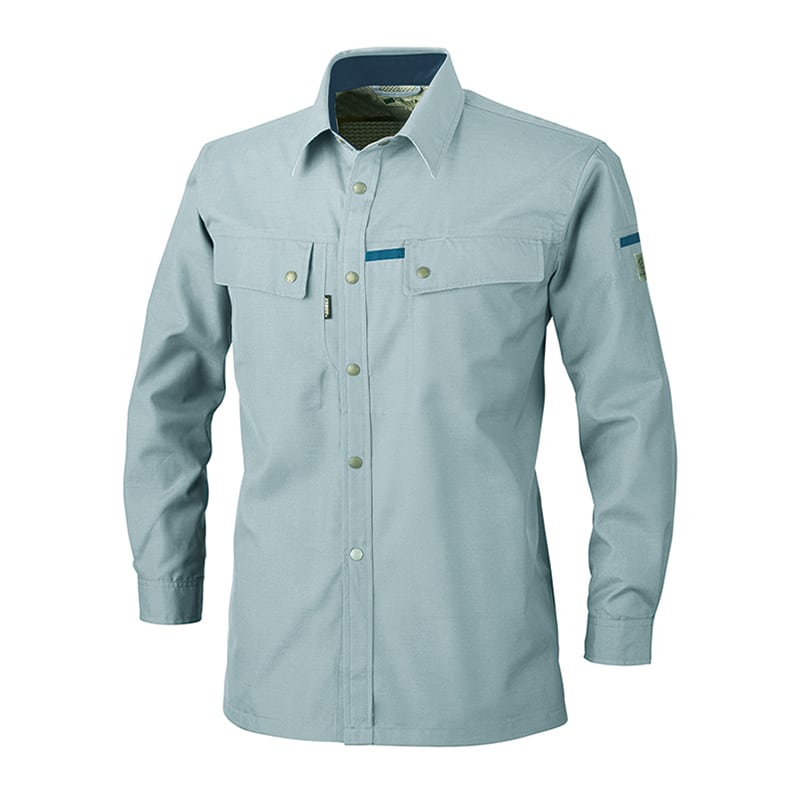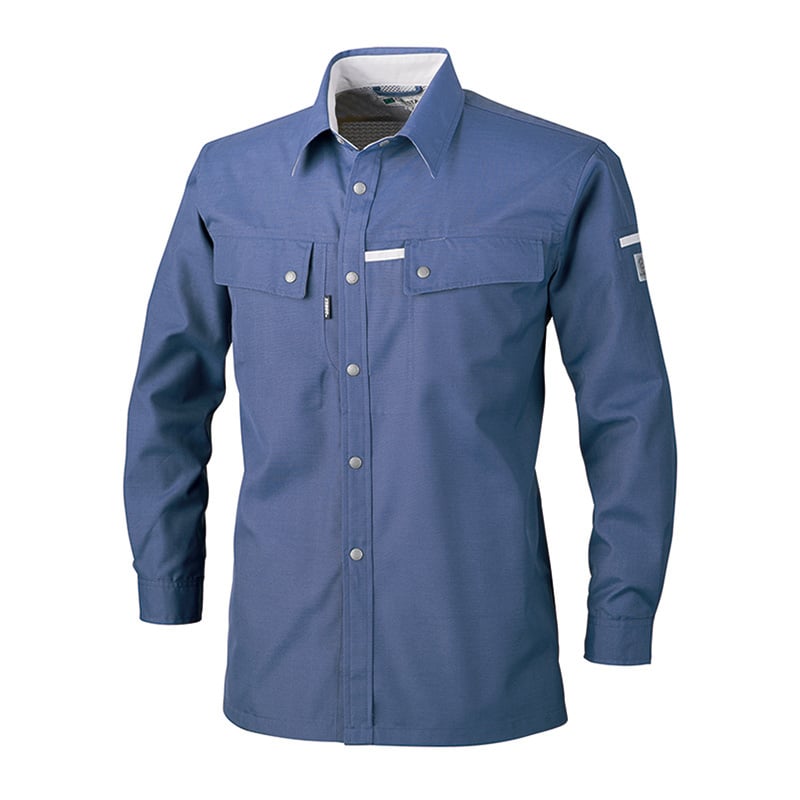 丈夫なポリエステルと綿の混紡素材を使用し、通気性の良いメンズ長袖シャツ。帯電防止対応。両脇はモノが落ちにくい逆玉ポケット。背中両サイドにプリーツを入れ、腕の上げ下ろしや前への動きをスムーズにするノーフォーク仕様。左胸ポケットにネームホルダーループ付き。左袖、左胸ポケットにペン差し付き。深さたっぷりの右胸ファスナーポケット。金属製カフスボタンは傷づけにくい隠し仕様。●樹脂ファスナー●金属ドットボタン●右胸ポケット:巾14×深さ16.5cm●左胸ポケット:巾14×深さ17cm●右胸ファスナーポケット:巾12.5×深さ19cm