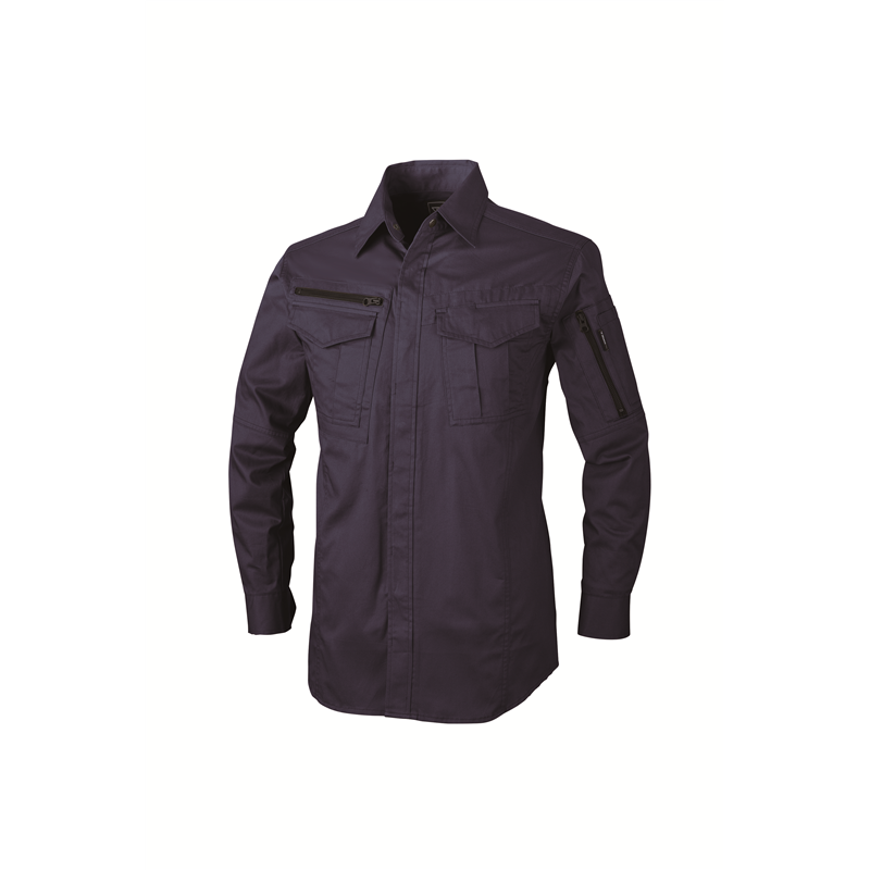 火に強く、吸水性の良い綿素材を使用したメンズ長袖シャツ。ハードな現場に最適。左袖と左胸ポケットにペン差し付き。袖、ボタンは隠し仕様でモノを傷つけにくく、金属製で丈夫。左胸は丈夫なファスナーポケットでモノが落ちず、深さもたっぷり。●金属ファスナー●金属ドットボタン●胸ポケット:巾11.5×深さ14cm●右胸ファスナーポケット:巾12.5×深さ19.5cm