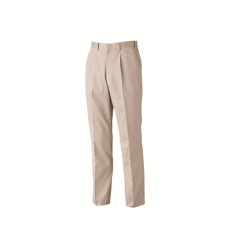 薄手で丈夫な定番メンズスラックス。右脇ポケットの内側はコインポケット付き。ウエスト部はシャーリング仕様で屈伸時の窮屈感を軽減。