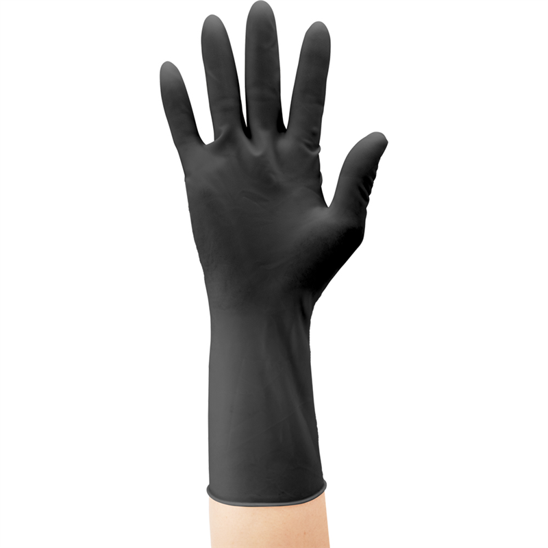 ヘアカラー剤の汚れが目立たないブラック色を採用。製造時にアレルゲンである加硫促進剤やたんぱく質を除去。パウダーによるアレルギーやかぶれも軽減。操作性が高いグローブ。●パウダーフリー。●エンボス加工。●左右兼用。●内容量:50枚