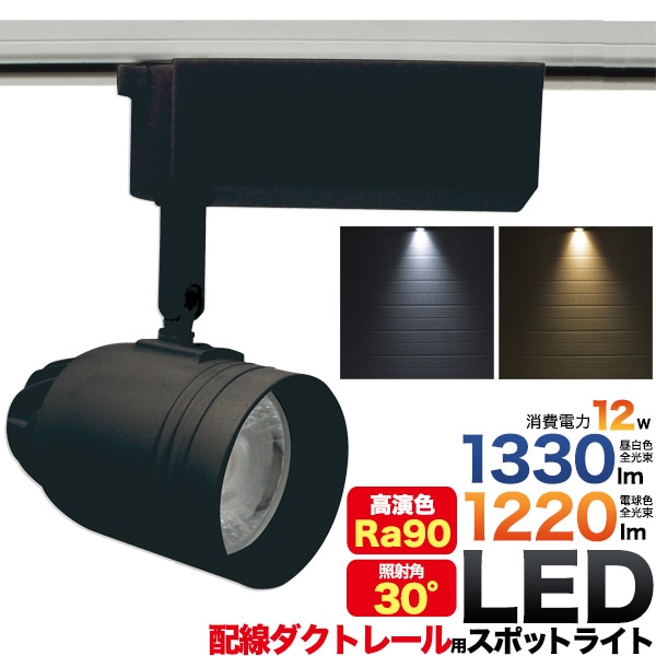 全光束昼白色1330lm、電球色1220lmを実現した、高輝度12W LEDダクトレールスポットライト。従来の同タイプハロゲン80W形から変更することで、電気代は大幅に節約できます。5.4年分使える長寿命設計。長時間使う部屋や、取り替えにくい所にオススメです。こちらのLEDダクトレールスポットライトはRa90(平均演色評価数)で商品の自然な色合いを引き出し、美しく綺麗に色味を実現します。ライトは首振り約90°、340°回転も可能なので、照らしたい角度に向けることができます。昼白色相当5700Kと電球色相当3000Kの2種類の色温度からお選びいただけます。●仕様全光束:昼白色:1330lm/電球色:1220lm●2M直下照度:昼白色:700lux/電球色:680lux●消費電力:12W●演色指数:Ra90●照射角度:30●重さ:520g